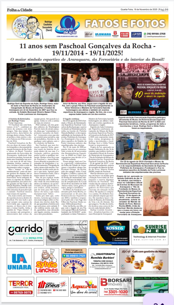 No último dia 19/11/2025 marcou a data de 11 anos que o Paschoal nos deixou precocemente…. Lutou bravamente contra um câncer e acabou não resistindo a doença, falecendo no dia 19/11/2014, véspera do dia da consciência negra, data em que foi enterrado no cemitério São Bento. De lá para cá decorreram 11 anos de ausência do Paschoal em eventos esportivos, clubes associativos, deixando de organizar campeonatos nas mais diversas modalidades esportivas, principalmente futebol, que era sua maior paixão, enfim, quantas pessoas deixaram de ser homenageadas nesse período, deixaram de ser reconhecidas pelo talento no esporte, jantares e confraternizações que não foram mais realizadas, jogos dos padres x fotógrafos, atração que realizava sempre no aniversário da cidade…. Só nos resta as memórias, as boas lembranças, e dentro do possível o desejo de manter vivo o legado deixado pelo Paschoal, principalmente seu acervo deixado em forma de museu, que hoje pertence à Prefeitura Municipal de Araraquara, cuja gestão está a cargo da Secretaria de Esportes, a quem aproveitamos a oportunidade para pedir, humildemente que não meça esforços no sentido de preservar tal acervo, valiosíssimo para a história do esporte amador e profissional e da nossa gloriosa Ferroviária. Fica o registro, para lembrança de todos os esportistas, familiares, amigos e simpatizantes do trabalho e da pessoa que o Paschoal foi e representa para Araraquara…. Nossa eterna Gratidão ao jornal Folha da Cidade que sempre cedeu espaço para o Paschoal divulgar os eventos e fotos do esporte em geral em suas páginas esportivas…. e também ao amigo, jornalista esportivo Rodrigo Coutinho Sossolote, o “Soró” que hoje tem esse espaço no jornal e homenageia o Paschoal com suas publicações frequentemente….